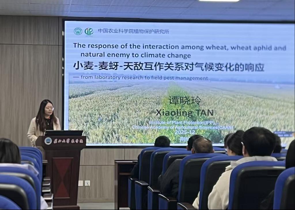 (通讯员 王旭)12月4日下午,应农学院周锦华书记、苏奇副院长和王福莲教授的邀请,中国农业科学院研究员张永军和谭晓玲为农学院师生分别作题为“中国农科院植保所农业昆虫创新中心发展历史及发展现状”和“小麦-麦蚜-天敌互作关系对气候变暖的响应及害虫绿色防控”的学术报告。报告会由苏奇主持。