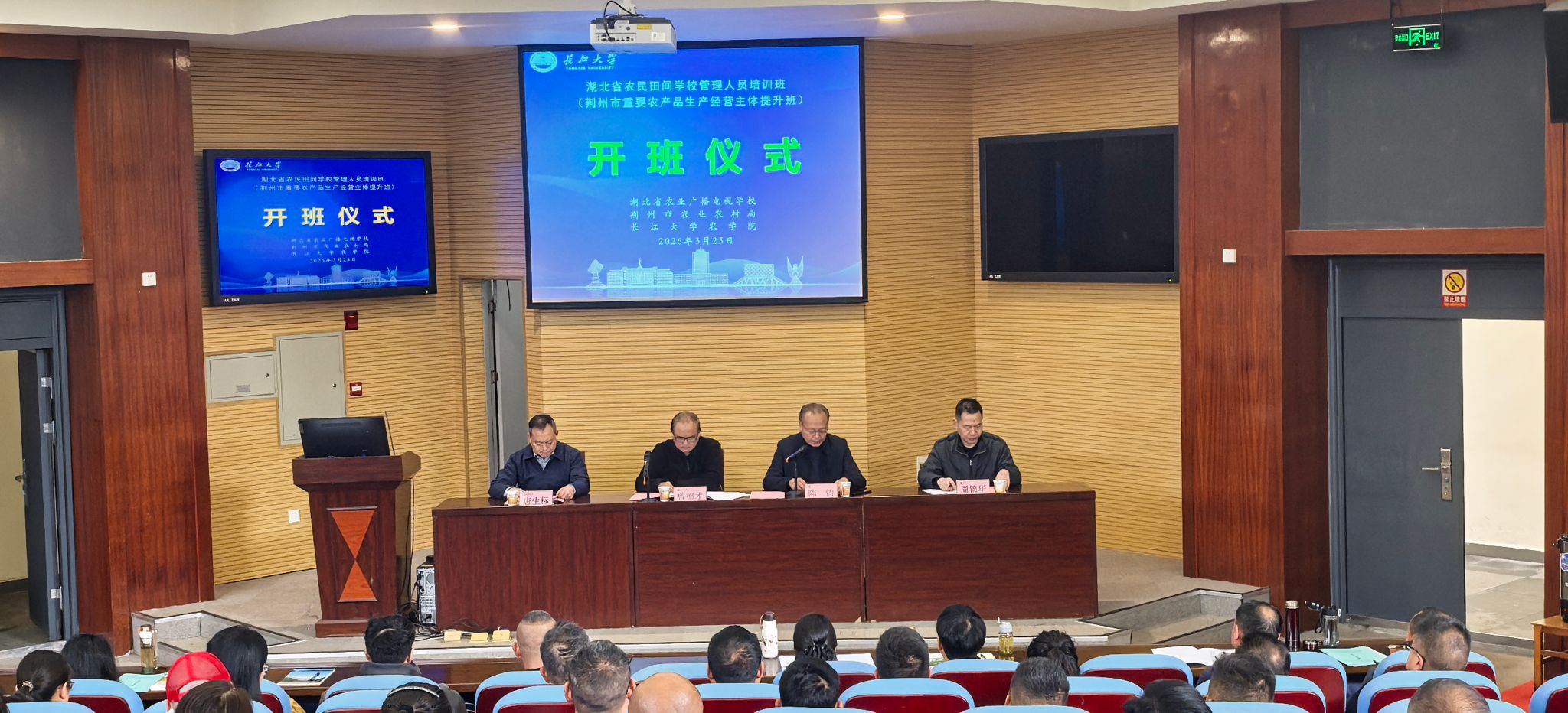 (通讯员 吴霞)为深入贯彻落实乡村振兴战略,全面提升湖北省农民田间学校管理水平与重要农产品生产经营主体综合能力,3 月 25 日至 4 月 2 日,湖北省田间学校管理人员培训班暨荆州市重要农产品生产经营主体提升班在长江大学成功举办,来自全省各地的100 名学员参训。 湖北省农业广播电视学校副校长陈钧、荆州市农业农村局二级调研员曾德才、长江大学农学院党委书记周锦华出席开班仪式,仪式由长江大学农学院副院长唐生标主持。开班仪式上,曾德才为学员讲授行政第一课,陈钧作开班动员讲话。 本次培训分2个班次进行,为期 9 天,采用 “理论授课 + 实操演练 + 现场教学”相结合的方式进行授课。课程设置兼具专业性与实用性,涵盖农业建设项目及管理、“三品一标” 认证、AI 赋能农业企业管理、农产品供给与市场营销及综合素养等课程,配套沙盘演练、现场教学等实践环节,并加强了经验交流。 本次培训有力促进找准农民田间学校提档升级方向及示范带动能力的提高,培训结束,学员纷纷表示:培训收获很大,回去后将学以致用,努力在乡村人才孵化、新农人培育、新品种示范、新技术推广、产品初加工及产销对接发挥积极作用,为当地农业高质量发展和乡村振兴贡献力量。 (审核唐生标 编辑吴霞)