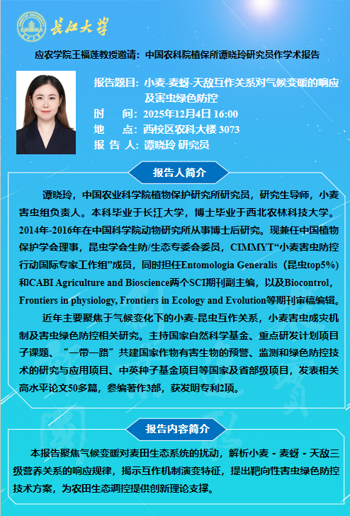 农学院2025年学术报告(二十八):小麦-麦蚜-天敌互作关系对气候变暖的响应及害虫绿色防控