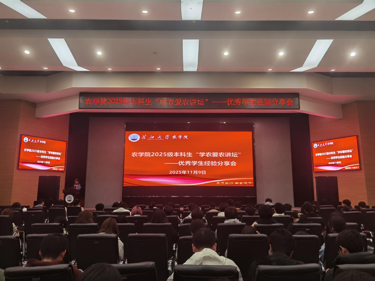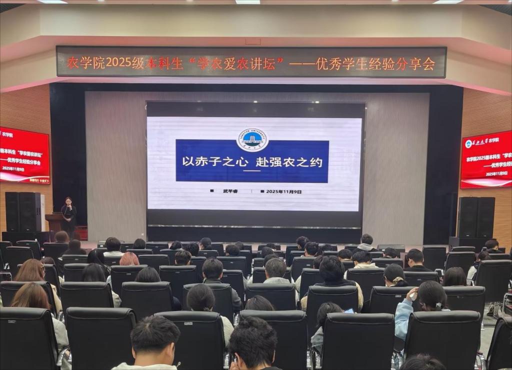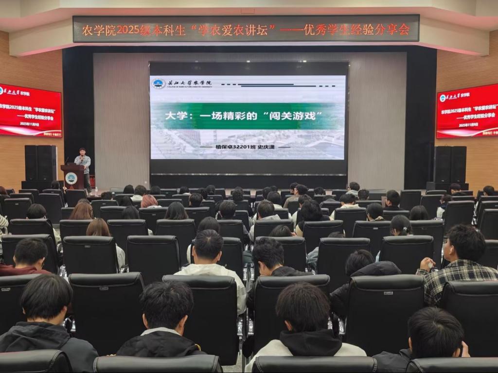 (通讯员 刘佳昊 康新陈 吴静宜/文 张源康 胡雪晴 吴泓萱 向建华/摄)为厚植学子学农爱农情怀,筑牢强农兴农使命担当,积极践行“厚德笃行、丰食天下”的院训精神,11月9日19:00,我院于农科大楼1058报告厅举办 2025 级本科生“学农爱农讲坛”——优秀学生经验分享会。辅导员唐玉婷与2025级农学院全体学生齐聚一堂,共同聆听优秀学子的成长故事。本次分享会由张可欣同学主持。