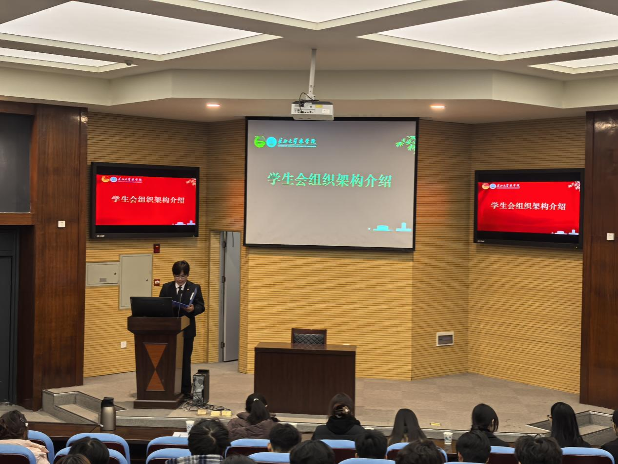 会议伊始,主持人详细介绍了本届团委学生会组织架构。团委学生会以主席团为核心,下设 12 个职能部门,各部门分工明确、协同联动,构建起覆盖学生服务、活动组织、日常管理等多维度的工作体系,成为连接学院与师生的坚实桥梁。过去一年,在学院党委的坚强领导和团委的悉心指导下,团委学生会坚守 “服务同学,成长自我” 的初心,开展了一系列扎实有效的工作,为学院建设与学子成长注入青春活力。
