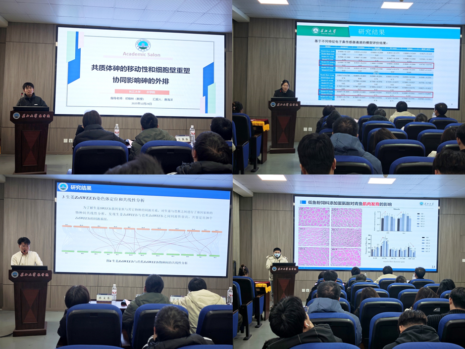 随后,四位来自不同学院的主讲人依次登台,分享前沿研究成果。农学院唐海洋深入剖析共质体砷移动性与细胞壁重塑的协同外排机制,为重金属污染农田的植物阻控提供了切实可行的策略,为土壤污染治理开辟新路径;园艺园林学院马佳伟对生姜SWEET基因家族展开鉴定与初步功能研究,明确糖转运与风味物质积累的内在关联,为香辛作物分子育种筑牢理论根基;动物科学技术学院明凯在低鱼粉饲料中添加蛋氨酸,系统评估青鱼生长、免疫、营养代谢及肌肉品质指标,为水产减抗养殖和鱼粉替代提供有力数据支撑,助力水产养殖业可持续发展;生命科学学院熊群艳构建机器学习模型,精准提取六堡茶挥发性谱图中的关键香气辨别因子,实现茶样香气快速分类,为茶叶品质鉴定和风味研究提供全新技术手段。