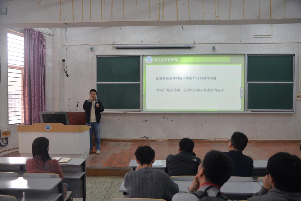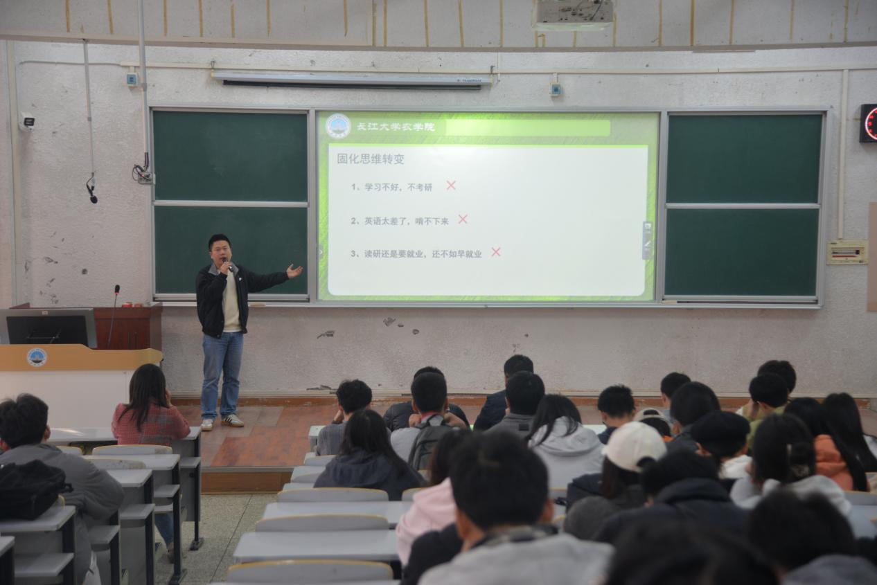 讲座中,黄承石以详实数据剖析当下考研、考公、考编、国企校招等赛道的报录比趋势,清晰对比农科学子本科直接就业与读研后就业的岗位发展、薪资水平、行业壁垒等核心差异,让同学们直观认识不同选择的发展前景。他结合学院考研上岸学生绩点分布数据,为不同学业基础的同学提供精准报考建议,同时打破 “学习不好不考研” 等固化思维,引导大家立足自身特质理性规划。