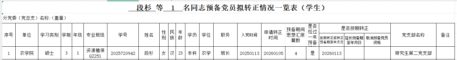 经过党支部对预备党员1年的培养教育和考察,经支部委员会会研究确定,报分党委(党总支、党工委)审查同意,将于近期召开党员大会讨论 段杉 同志预备党员转正,特在 学院官网 范围内进行公示。