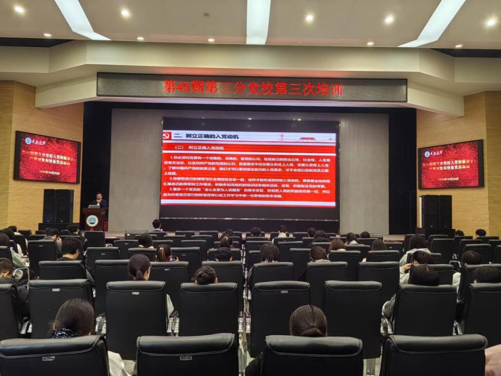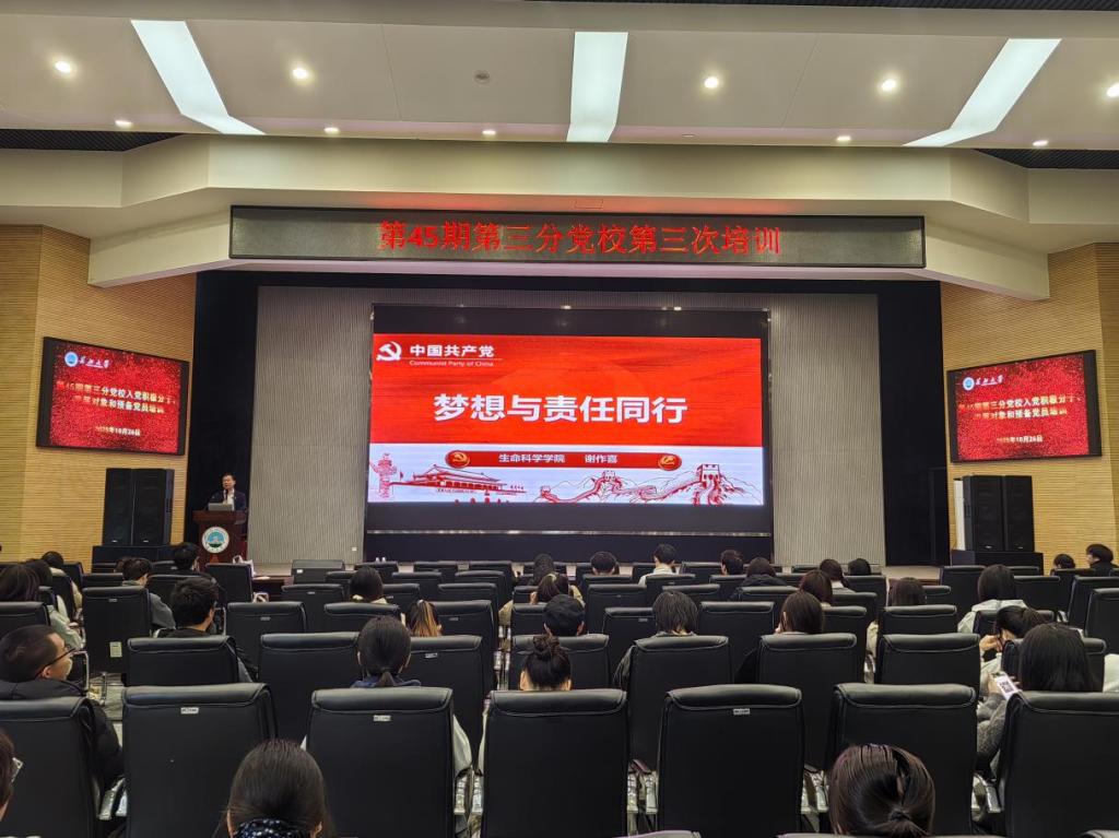 (通讯员 方学斌 严树彬/文 王浩源 王思雨 郑怡乐/摄)百年党史映初心,青春建功正当时。为深入学习贯彻党的二十大精神,引导青年学员从党的百年奋斗历程中汲取信仰力量、砥砺使命担当,10 月 26 日下午 2 点 30 分,农学院在农科大楼 1058 报告厅如期开展第 45 期第三分党校第三次培训。本次培训以“梦想与责任同行”为主题,特邀生命科学学院党委书记谢作喜主讲,生命科学学院辅导员李敏和第三分党校全体入党积极分子、发展对象和预备党员参加,辅导员唐玉婷主持。