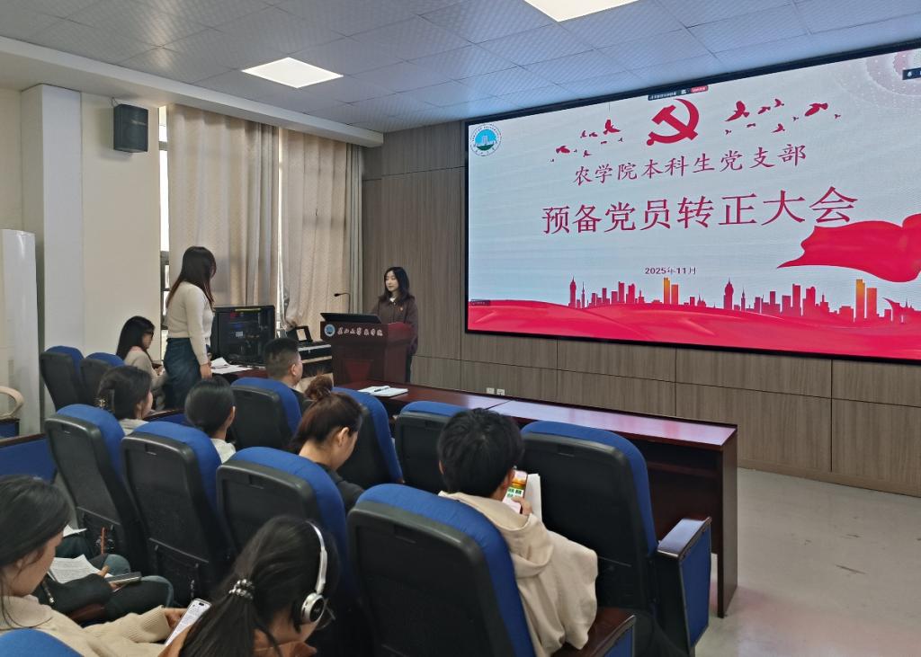 (通讯员 武芊睿)为进一步壮大和优化党员队伍,增强党组织的凝聚力与战斗力, 11月19日,农学院本科生党支部在农科大楼3073召开2025年下半年预备党员转正大会,讨论预备党员肖雅萱等3名同志的转正问题。应到会党员19名,实到会19名,应到会有表决权的正式党员7人,实到会7名,超过半数,符合党员发展流程。会议由党支部书记黄承石老师主持并作总结发言。