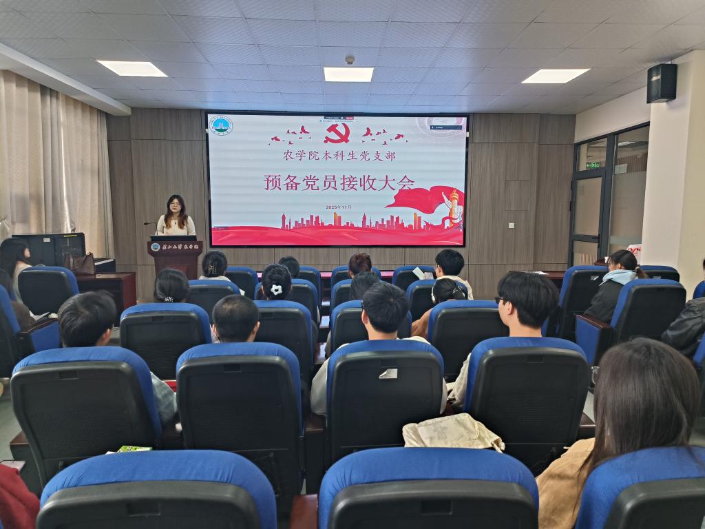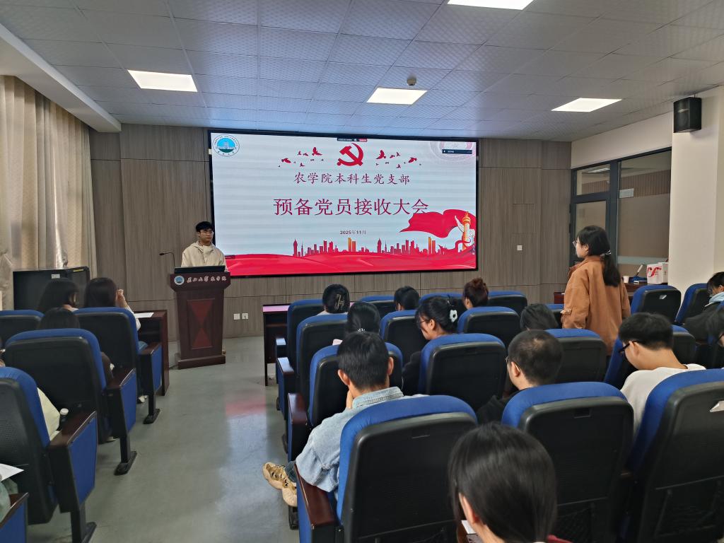 (通讯员 武芊睿)为确保新发展党员的质量,保持党员队伍的生机与活力,11月27日,农学院本科生党支部在农科大楼3073召开2025年下半年预备党员接收大会,讨论发展对象任飞越等5名同志的入党问题。应到会党员19名,实到会19名,应到会有表决权的正式党员10人,实到会10名,超过半数,符合党员发展流程。会议由党支部书记黄承石老师主持并作总结发言。