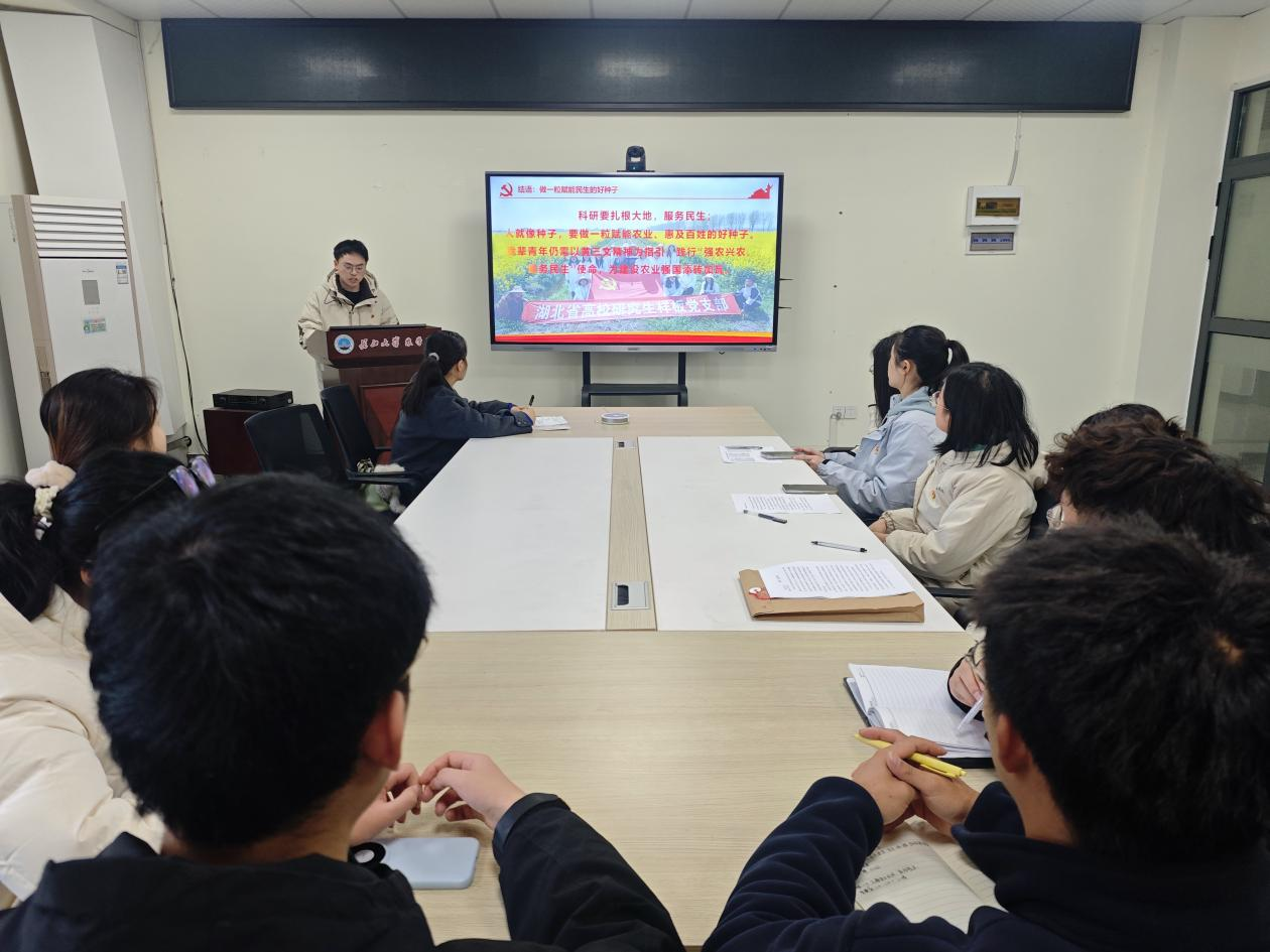 在交流研讨环节,与会党员以“深入学习贯彻党的二十届四中全会精神,结合《奋进“十五五”建功“双一流”——长江大学2026年新年献词》为主题展开讨论。王紫宜、帅亚婷、蔡露同志表示,将以长大精神为指引,立足专业研究,扎根基础领域、积极交流学习,深耕绿色防控病虫害研究,以专业本领为农业强国和母校“双一流”建设助力;将紧扣农业生产实际,完成毕业论文并凝练落地成果,秉持长大精神聚焦流域作物病害防控,为农业安全献力,为守护湖北粮食安全筑牢“隐形防线”。