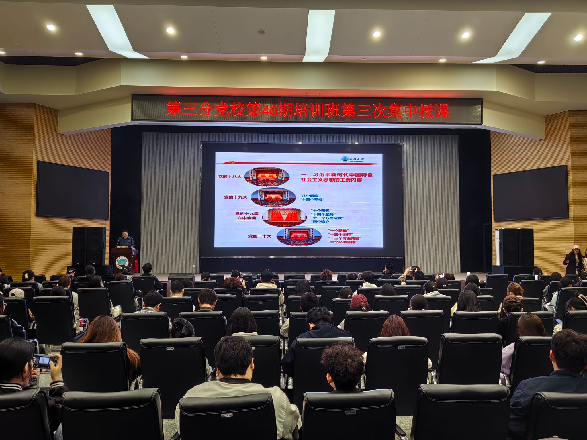 (通讯员 张源康/文 吴泓萱 胡雪晴/摄)为深入学习贯彻党的二十大精神,持续深化党史学习教育,筑牢青年学子思想根基,4月7日晚,第三分党校第 46 期培训班第三次集中授课在农科大楼1058报告厅顺利开展。本次培训聚焦学习贯彻习近平新时代中国特色社会主义思想主题教育,由农学院党委书记周锦华主讲,学院辅导员唐玉婷及第三分党校全体入党积极分子、发展对象、预备党员共同参与。