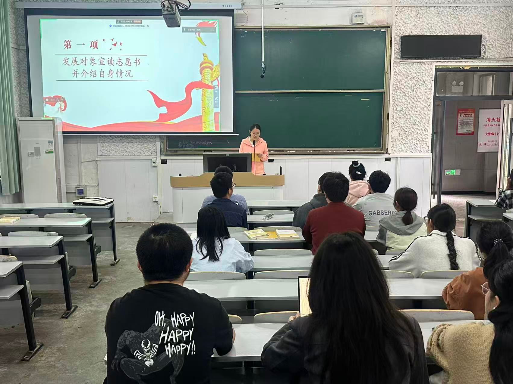 会议第一项,开展毕业生预备党员接受大会。会议按照接收预备党员的组织程序进行,发展对象宗召英同志宣读《入党志愿书》,并向党组织汇报自身情况;入党介绍人史庆潇同志介绍发展对象的培养考察情况并进行客观的评价;与会正式党员以无记名投票的方式进行表决,共发放表决票9张,收回表决票9张,最终,同意接收宗召英1名发展对象为中共预备党员。新发展的预备党员佩戴党员徽章后,在卜令钊同志的带领下,面向党旗,庄严宣誓。